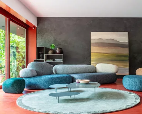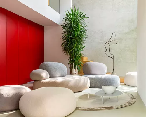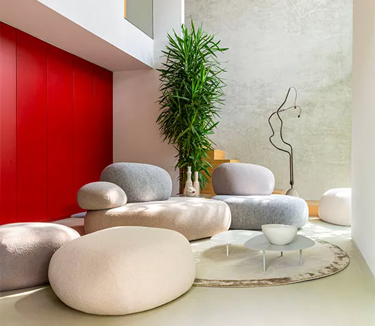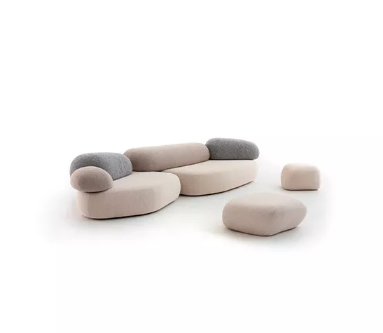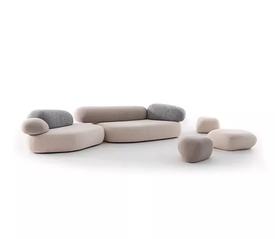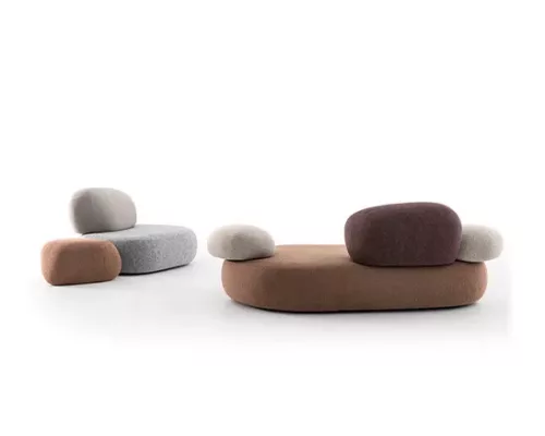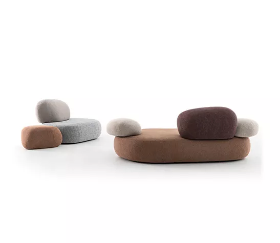 Bien que conçu essentiellement pour être utilisé dans des espaces publics, tertiaires et l’hôtellerie, le système Pebble Rubble comprend 15 modules multi-éléments (assise et dossiers) complétés par 3 poufs qui permettent – à l’architecte comme à l’amateur – de gérer de façon extrêmement libre, souple et créative les combinaisons.