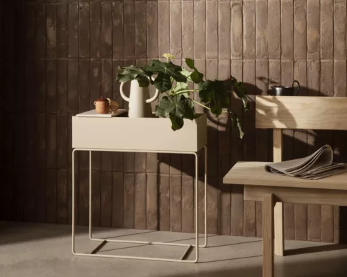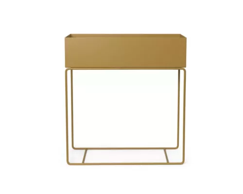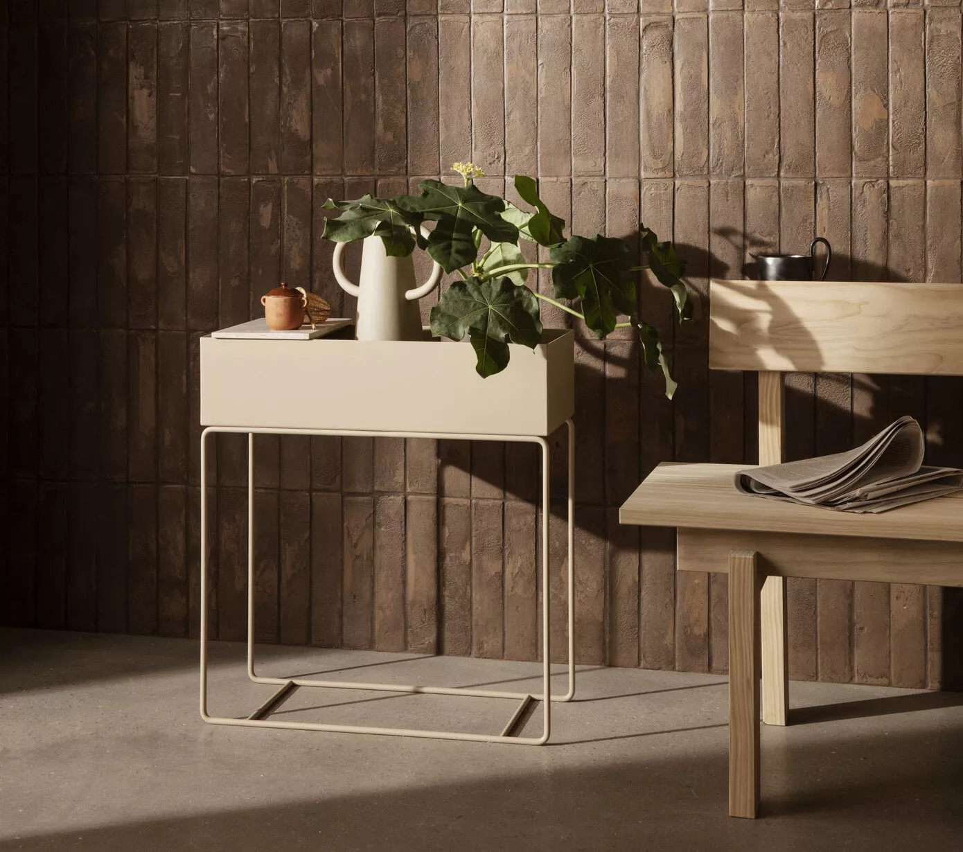 Il y a une esthétique élégante et intemporelle dans les bacs à plantes de Ferm Living et le design présente un contraste saisissant et intéressant entre la boîte rectangulaire sur le dessus et les pieds métalliques fins.
