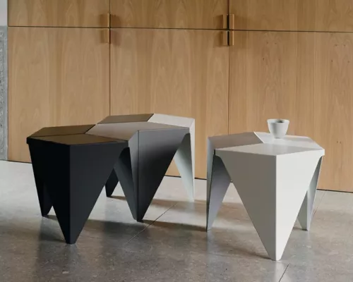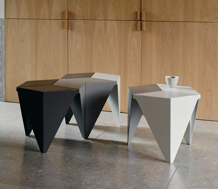La forme géométrique de la Prismatic Table est constituée de trois éléments en tôle d’aluminium pliée, dotée d’une finition époxy haut de gamme.