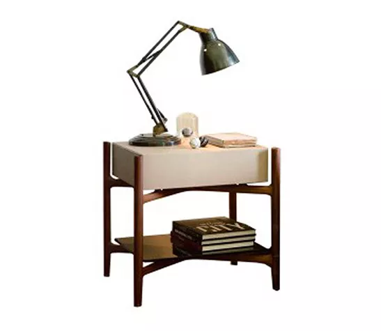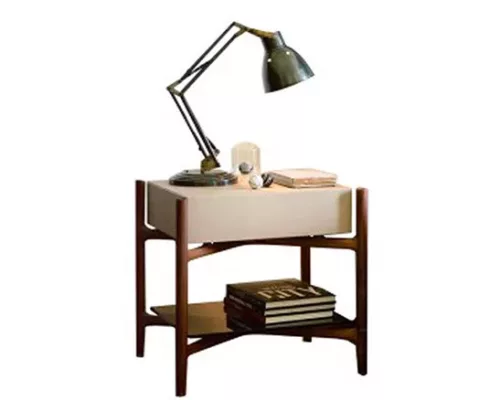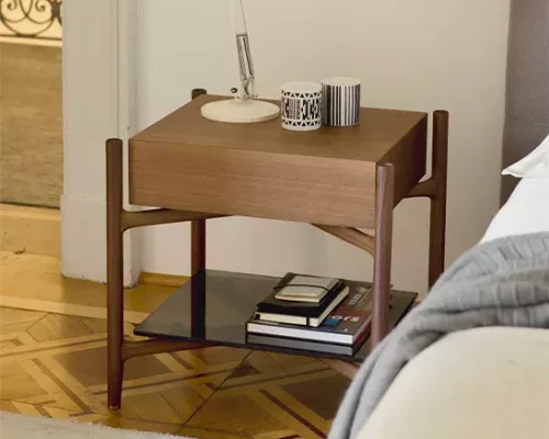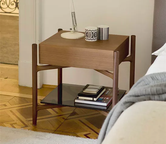 La structure est disponible en différentes finitions en bois de noyer, le produit est proposé avec un tiroir à fermeture amortie en bois ou recouvert de cuir, tous deux avec un plateau inférieur en verre.