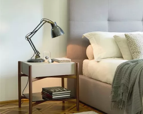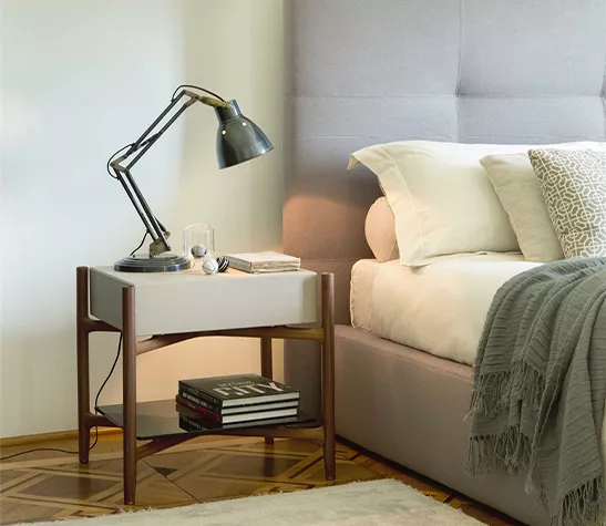 La table de chevet Regent de Porada a un design unique et léger grâce à la structure centrale qui semble flotter, soutenue par les pieds externes.