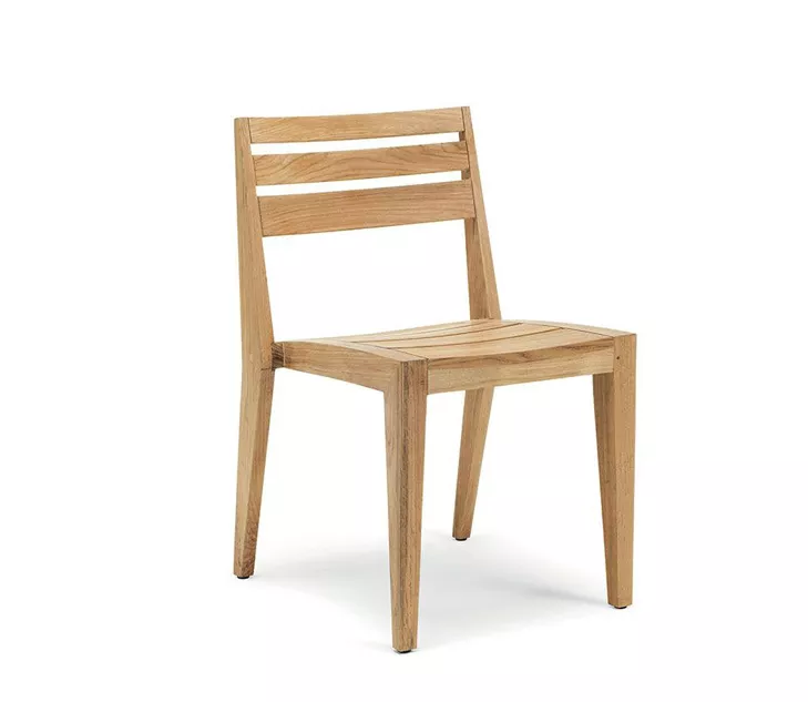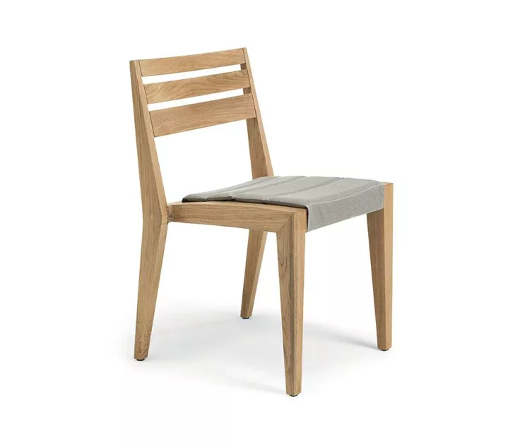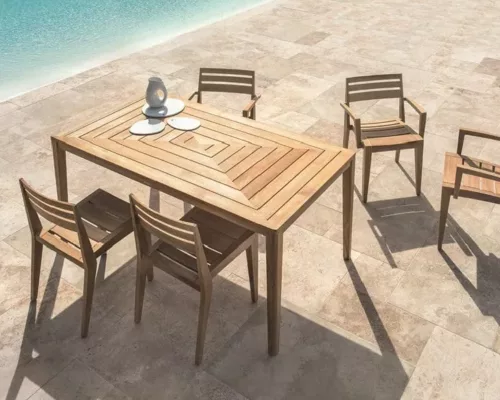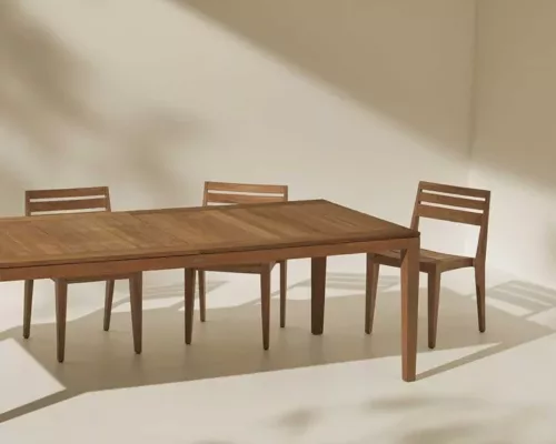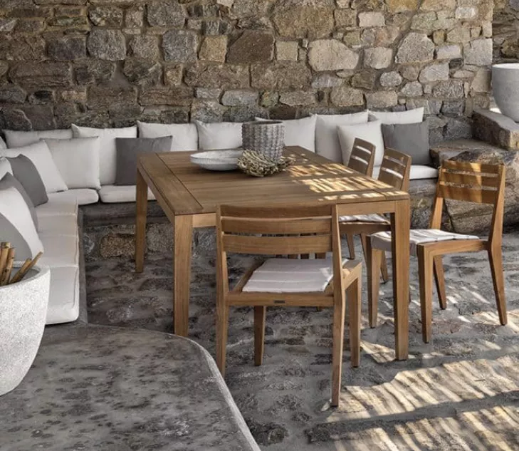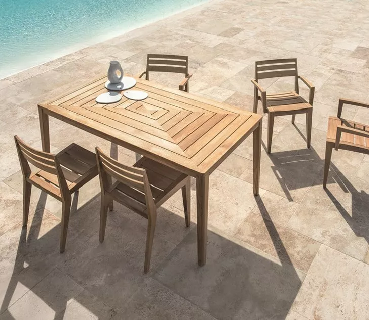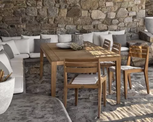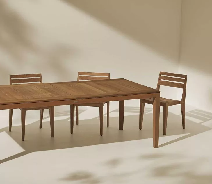 La collection de mobilier d'extérieur Ribot, créée par Marc Sadler pour Ethimo, est entièrement réalisée en teck massif naturel certifié.