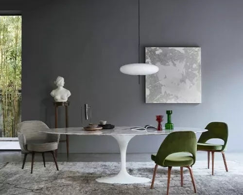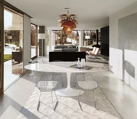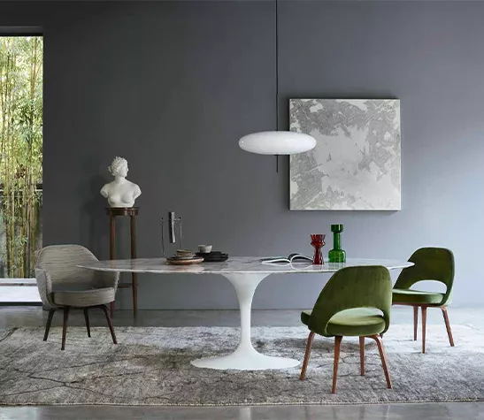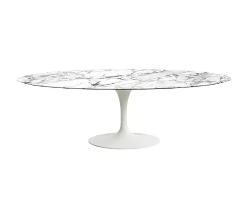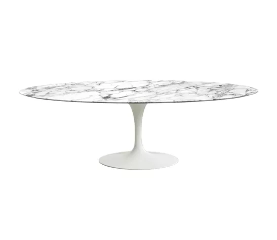 La gamme de tables Saarinen existe dans un large choix de finitions : plateau en marbre, en stratifié, en bois, en bois laqué ou en résine minérale pour l’extérieur et dans différentes tailles : tables rondes, ovales, basses et guéridons. La base existe en version époxy noir ou blanc.