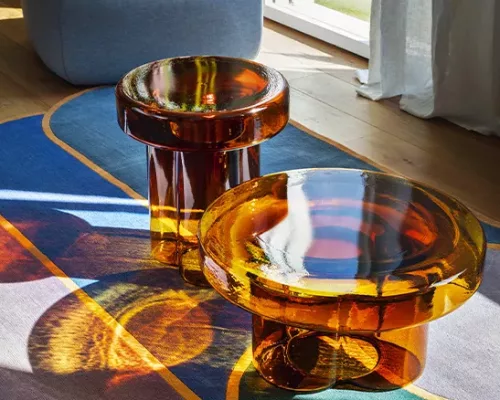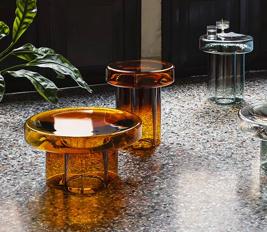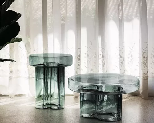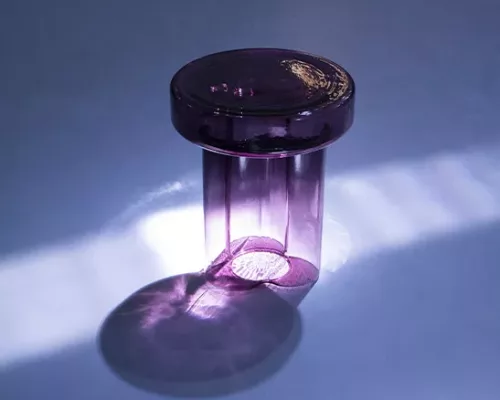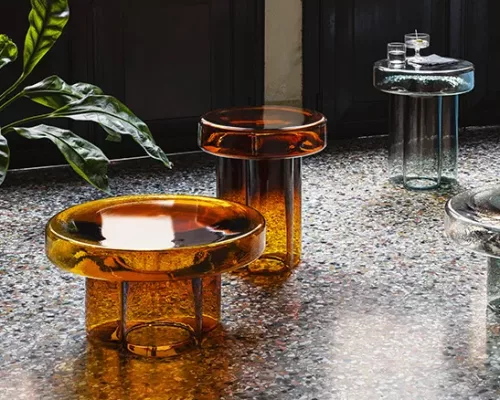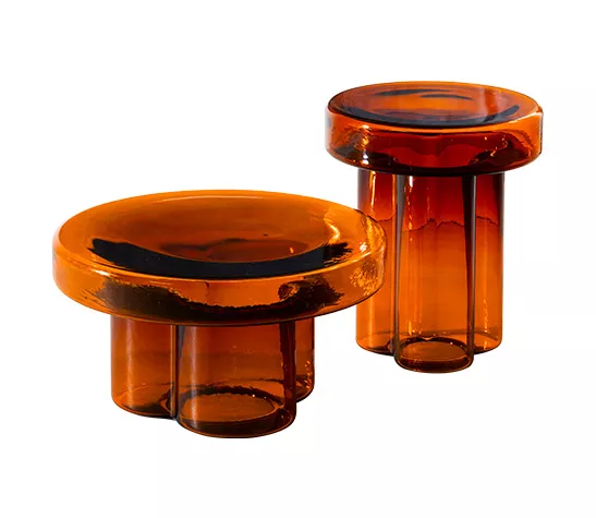 Dans Soda, le verre vibre : sa surface dure et martelée fragmente sa transparence pour donner une esthétique primitive. C’est une valeur artistique accordée à un produit industriel.