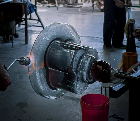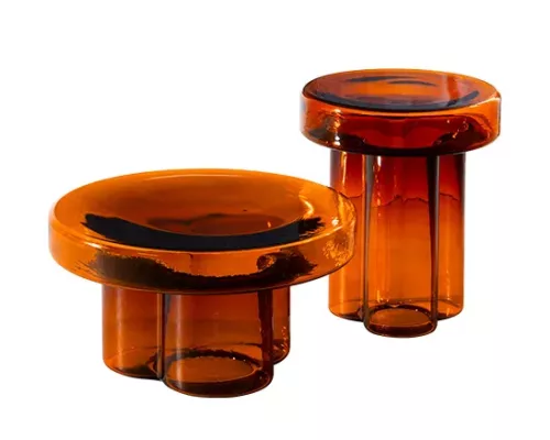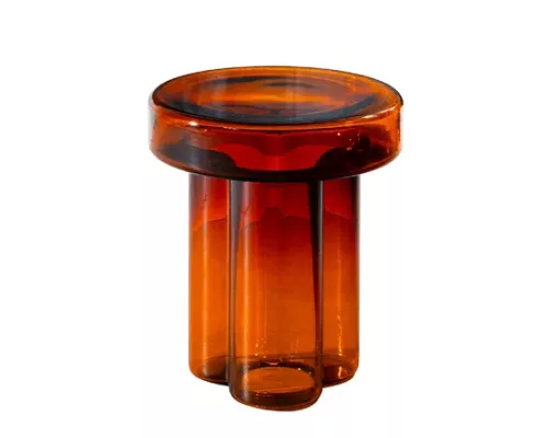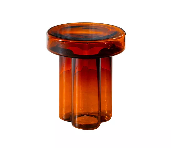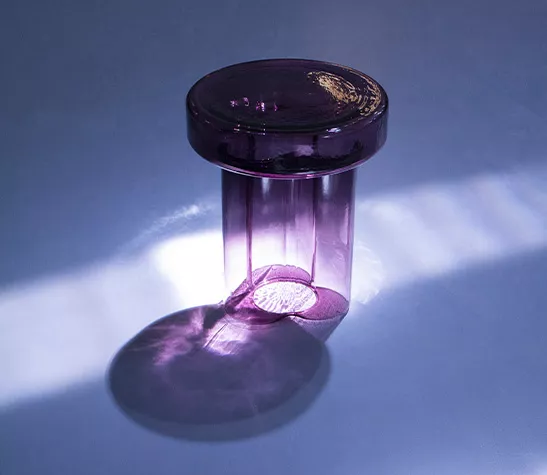 Le résultat est un seul volume de verre avec trois grands pétales formant la tige. Sa surface dure et martelée fragmente sa transparence pour donner une esthétique primitive. C’est une valeur artistique accordée à un produit industriel.