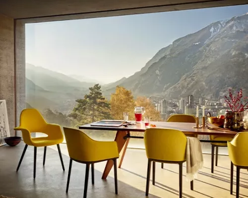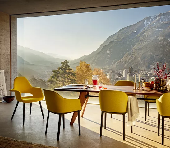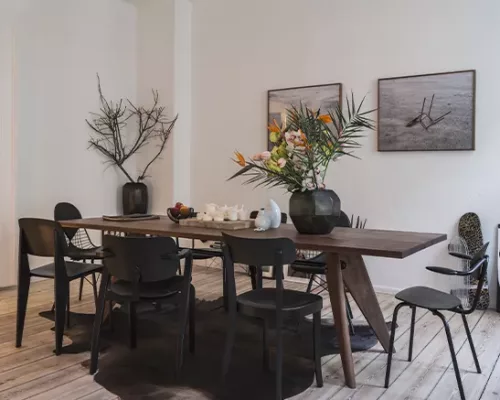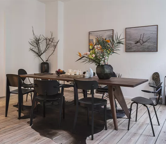Les composants en bois massif dans une sélection de chêne naturel, chêne foncé ou noyer américain confèrent à la table un sentiment d’aisance et de raffinement.