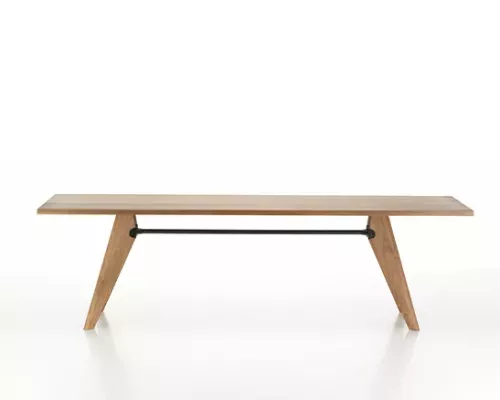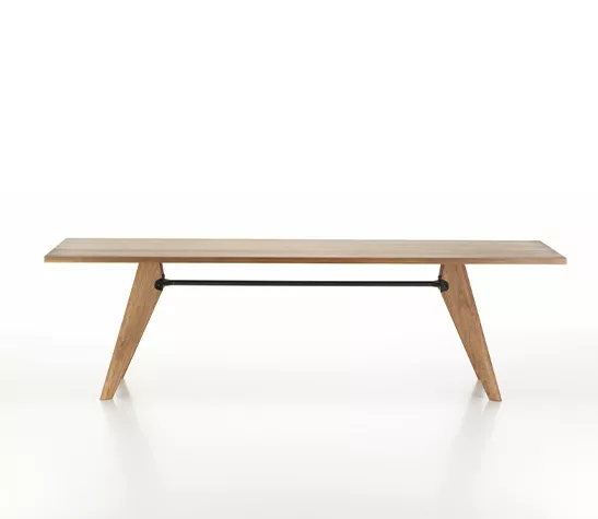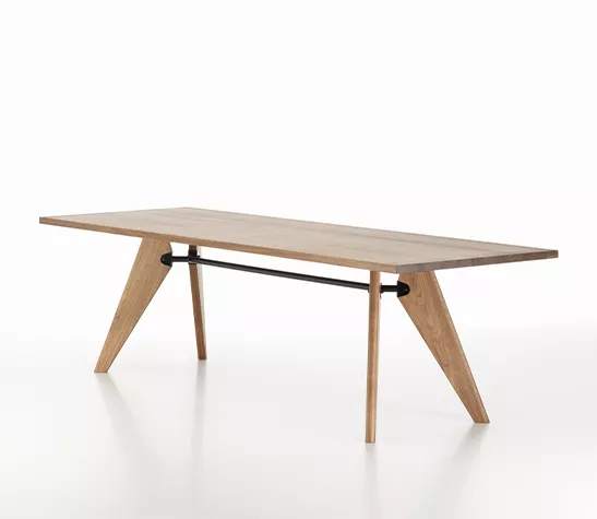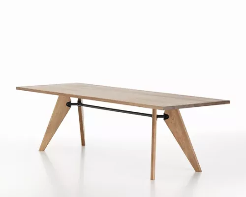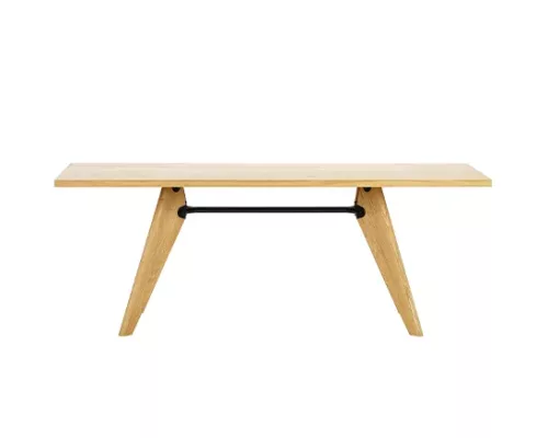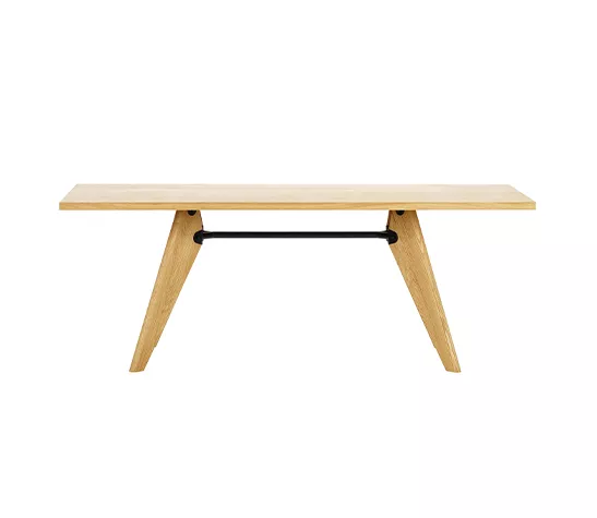Jean Prouvé développa la Table Solvay en 1941, en raison de la pénurie de métal à l'époque, il dessina le meuble élégant avec des pieds en bois.