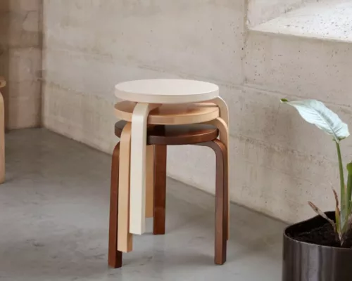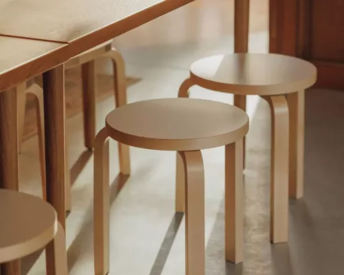 Stool 60 se distingue par son piétement en L, directement fixé au bois de l’assise d’Alvar Aalto, sans aucun châssis métallique. Le siège, entièrement en bouleau, est d’abord fabriqué par l’entreprise Oy Huonekalu-ja Rakennustyötehdas.