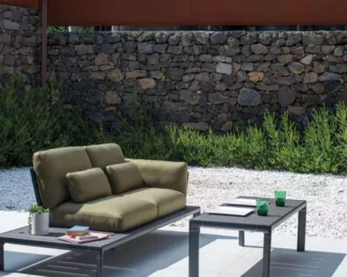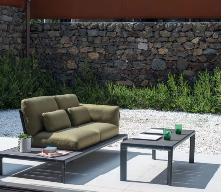 La collection comprend : fauteuil structure, canapé 2 places, canapé 3 places, structure d’angle, table basse en 2 versions.