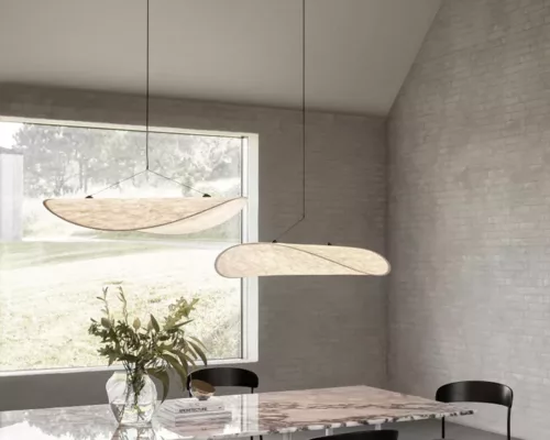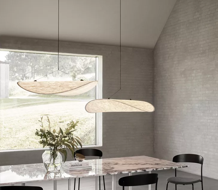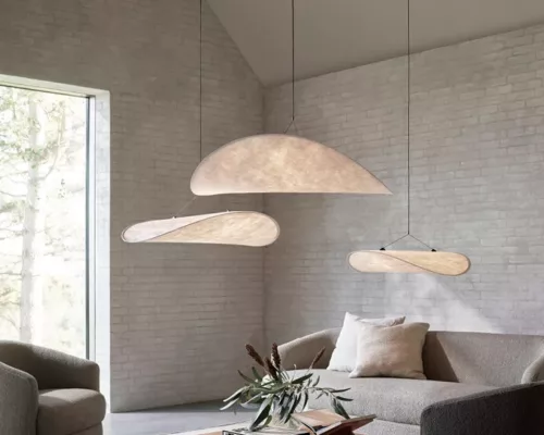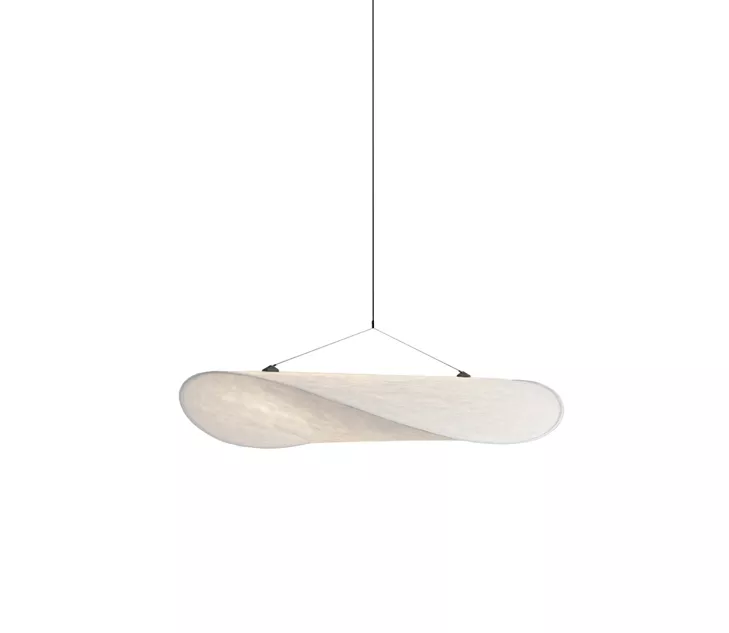 Conçue de manière résolument moderne, sa réalisation en Tyvek pour le diffuseur représente un matériau à la fois robuste et délicat, tout en étant entièrement recyclable. La flexibilité du diffuseur, similaire à celle du papier, permet à sa structure fine de mettre en avant les caractéristiques nuageuses de la suspension Tense.