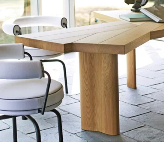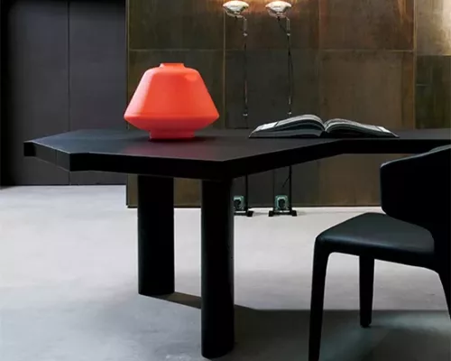 L’assemblage selon lequel les divers éléments fusionnent en un ensemble structurel extrêmement élégant et polyvalent est simple mais parfait et permet une interprétation transversale, comme table à manger ou comme bureau de direction, en fonction du cadre de vie.