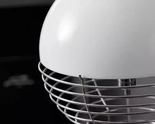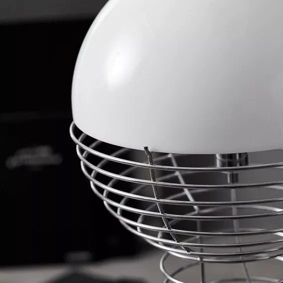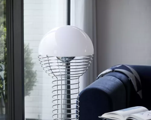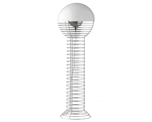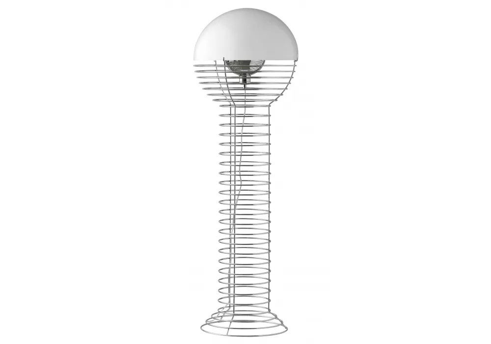 Le lampadaire décoratif Wire est défini par le cadre en fil d’acier chromé qui s’élargit au sommet pour soutenir l’abat-jour en plastique hémisphérique blanc. L’ampoule est contenue dans un petit réflecteur métallique également hémisphérique, qui guide la lumière vers l’intérieur de l’abat-jour. Le cadre métallique donne au design un aspect distinctif, mais très léger et non intrusif, et la nuance blanche offre beaucoup de lumière ambiante.