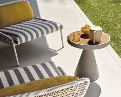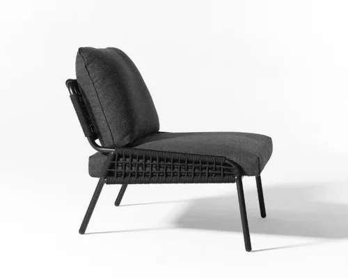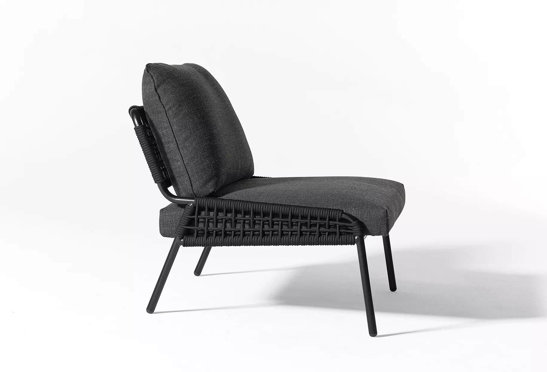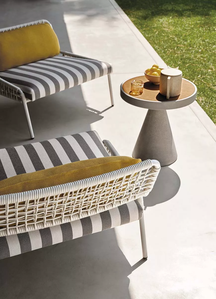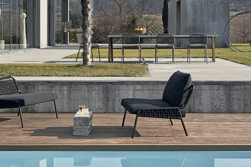 Le protagoniste est une corde en polypropylène, inspirée des cordes d’amarrage des bateaux, et soutenue par une structure en aluminium peint : les quatre couleurs disponibles – Chalk, Petrol, Elephant et Black – la rendent sophistiquée dans sa simplicité. Zoe Open Air est doté d’une assise rembourrée et d’un précieux tissage artisanal, disponible en deux versions, pour le dossier.