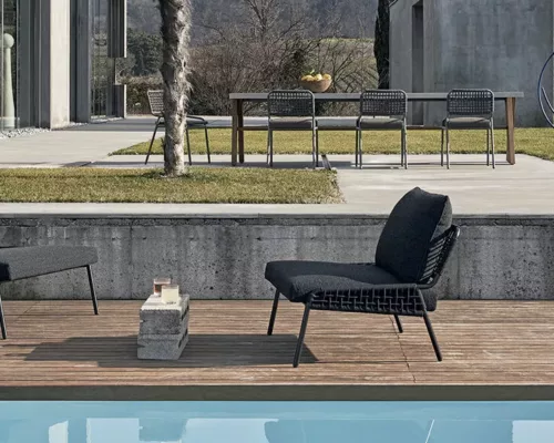 Zoe Open Air est une collection de fauteuils et de petits canapés qui se distinguent par la combinaison habile de matériaux d'extérieur.