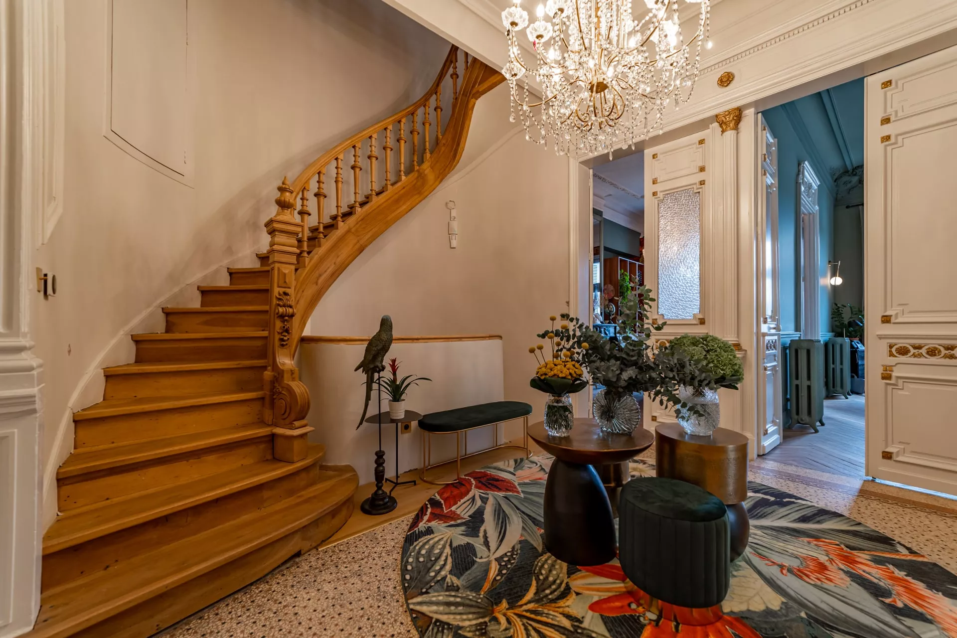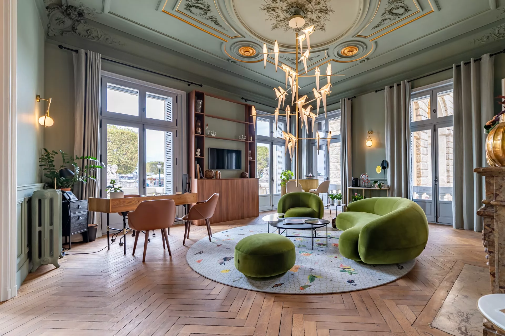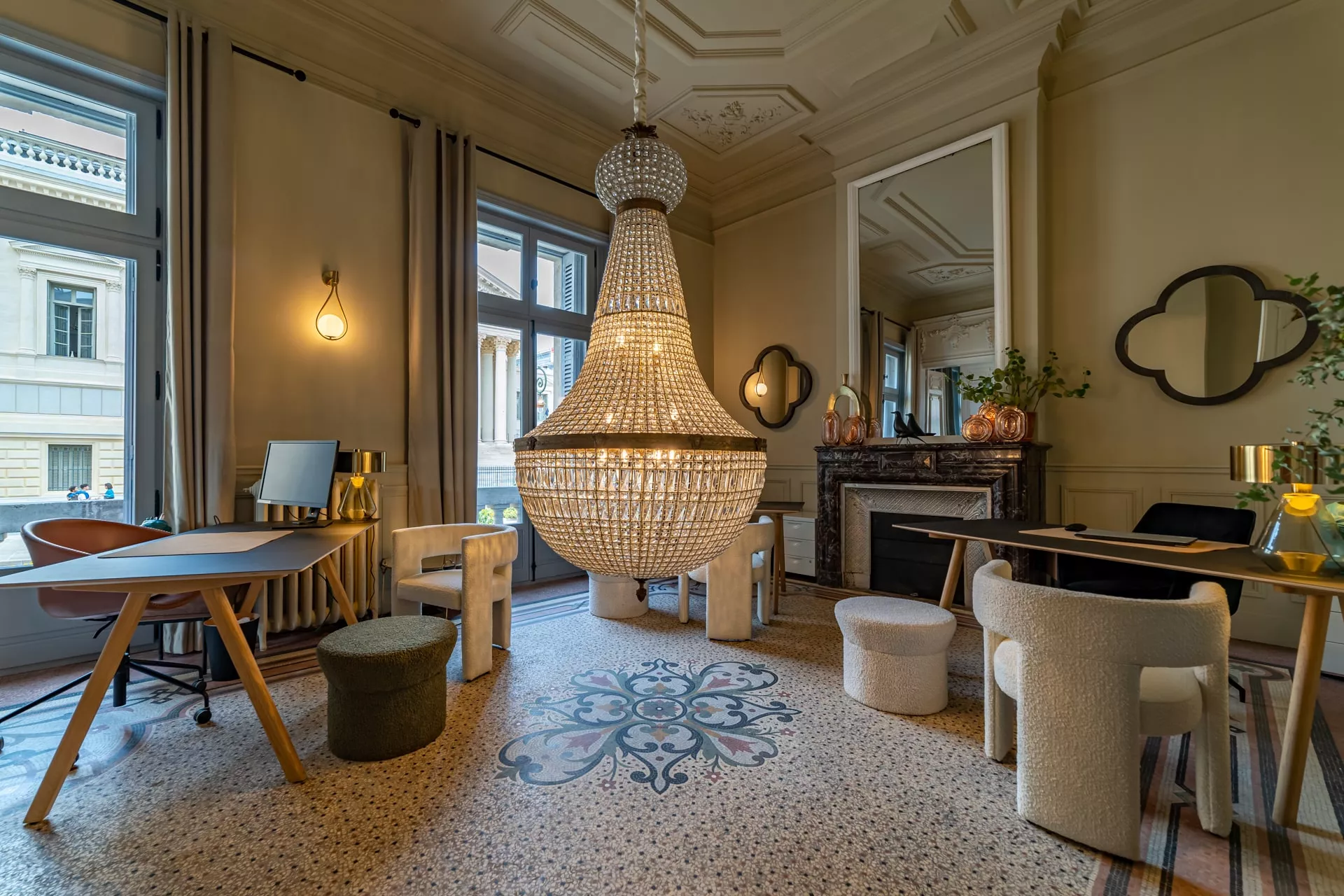 La rénovation complète des plafonds, du sol et des ouvertures reprend les codes architecturaux du passé en embellissant les plâtres, les boiseries et les parquets. L’espace a été ouvert pour offrir des salons de réception et des espaces de de réunion élégants. L’entre-sol a été entièrement repensé, créant un lieu convivial pour les repas ou les pauses café. À l’étage, des faux-plafonds ont été installés, la salle de bains a été supprimée, et aujourd’hui, trois bureaux et une salle de réunion dévoilent leur splendeur.