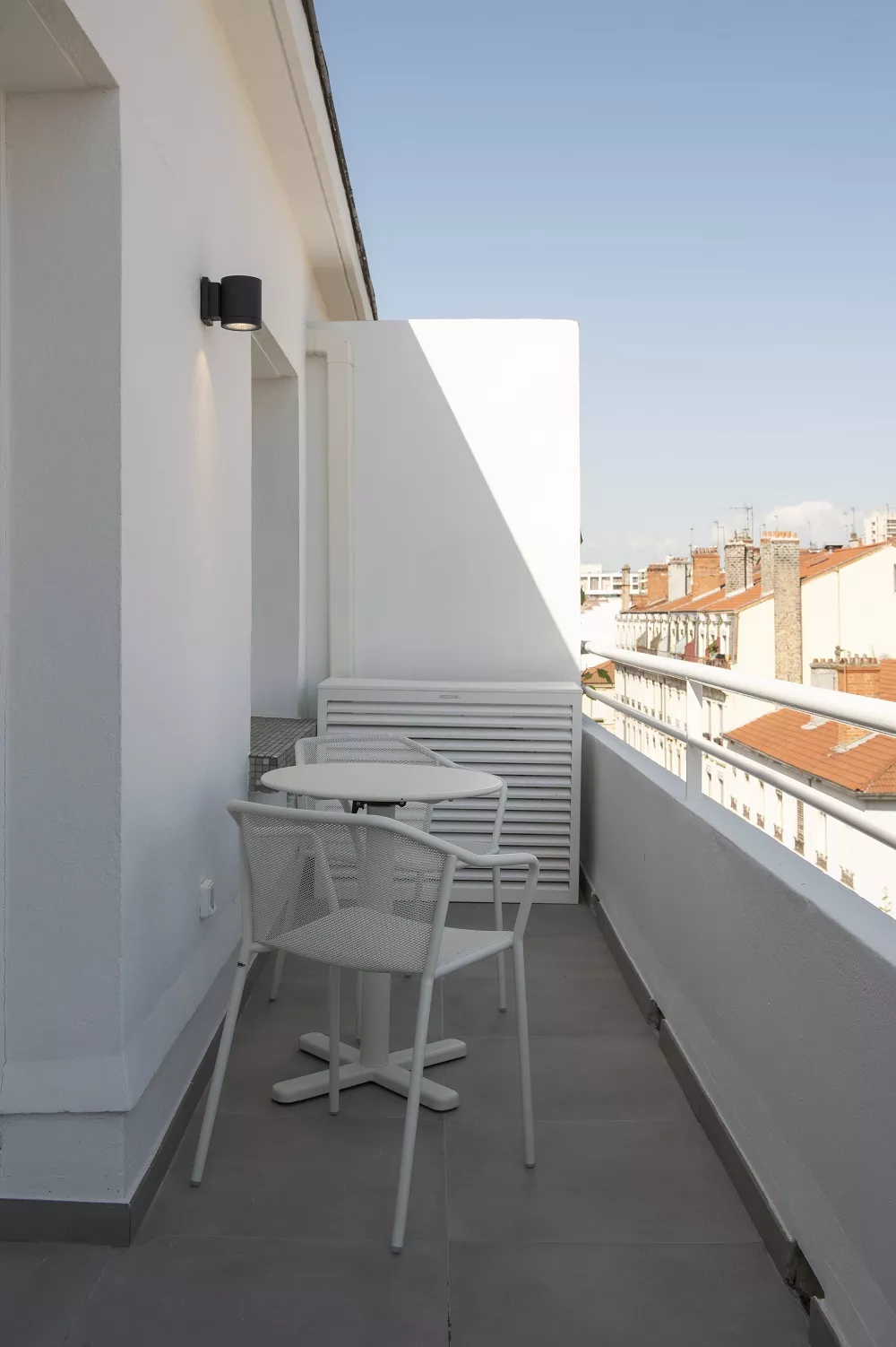 Cet appartement, traversant nord/sud, est situé au 7ème et dernier étage d’un immeuble à l’architecture conventionnelle construit dans les années 50. Il a été entièrement rénové par l'architecte Julien Fumat.