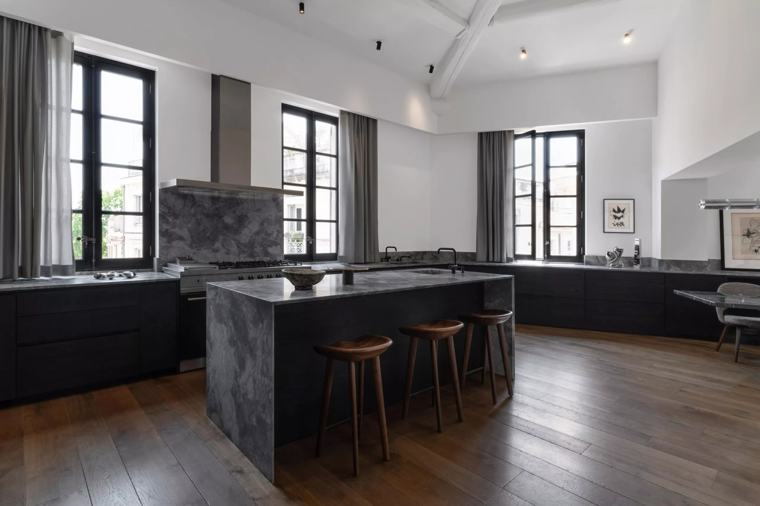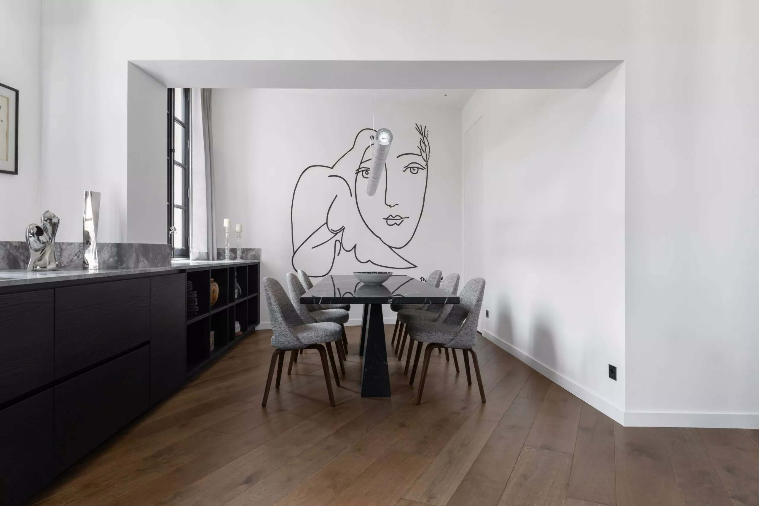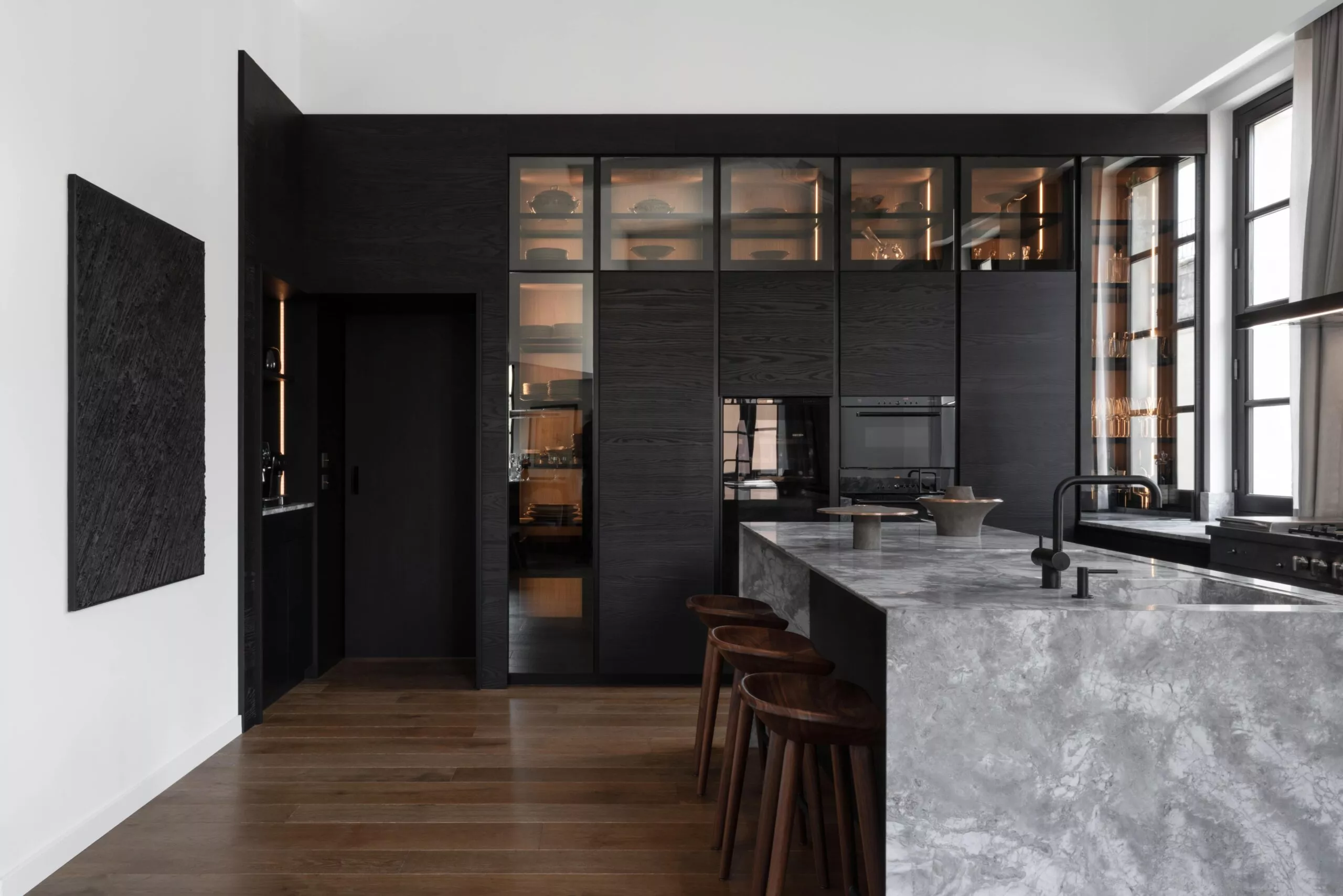 L’extraordinaire contraste entre ces espaces, avec une impressionnante hauteur sous plafond de 5 mètres, et les passages qui les relient, magnifiés par le choix de matériaux et des détails raffinés, confère à l’appartement une véritable singularité.