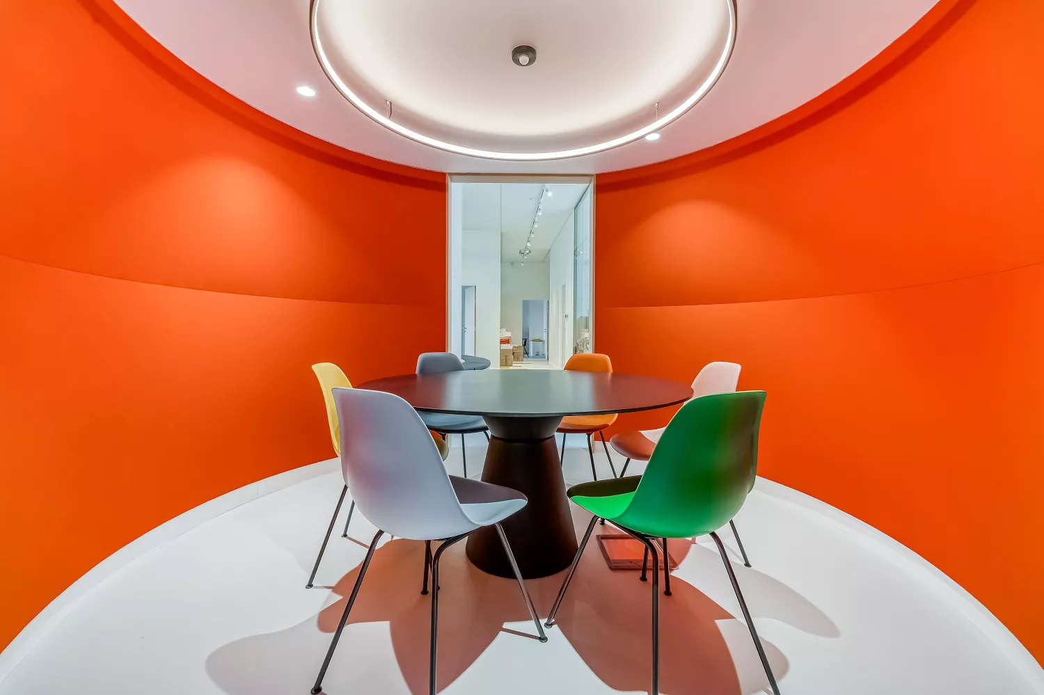 Les chaises Vitra dans des coloris vitaminés ont été choisies pour agrémenter la table Inclass.
