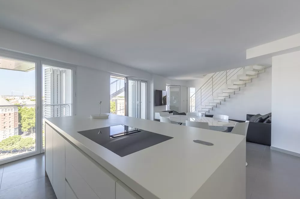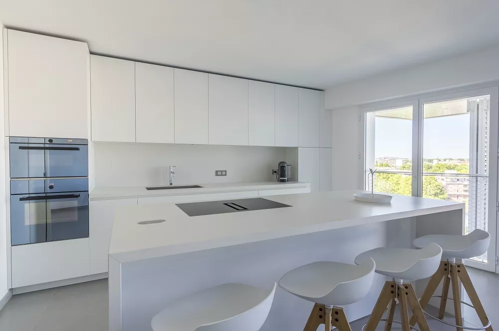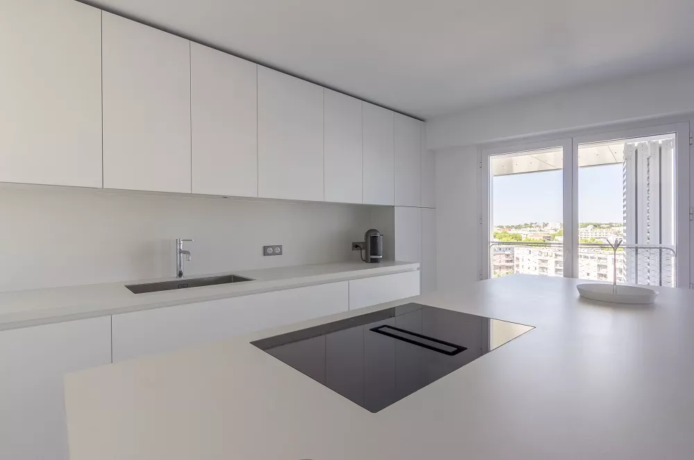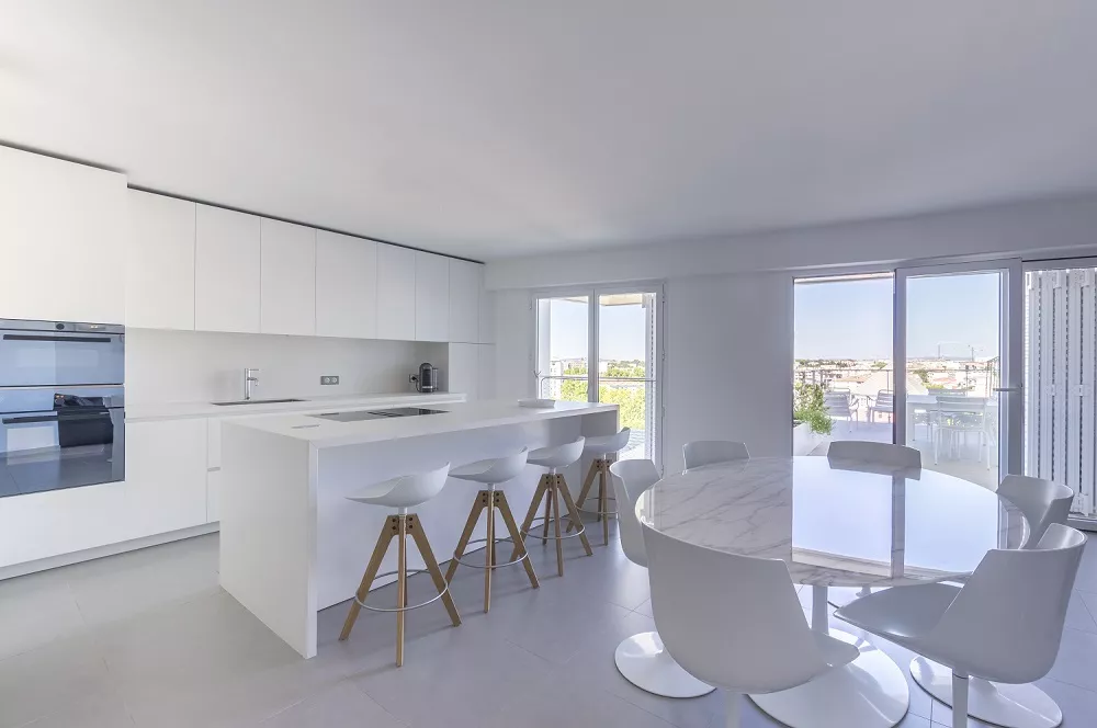 La cuisine, réalisée par l’équipe RBC Montpellier, rayonne d’un éclat blanc et immaculé dans l’espace, en parfaite résonance avec la localisation de cet appartement, au sein de l’Arbre Blanc.