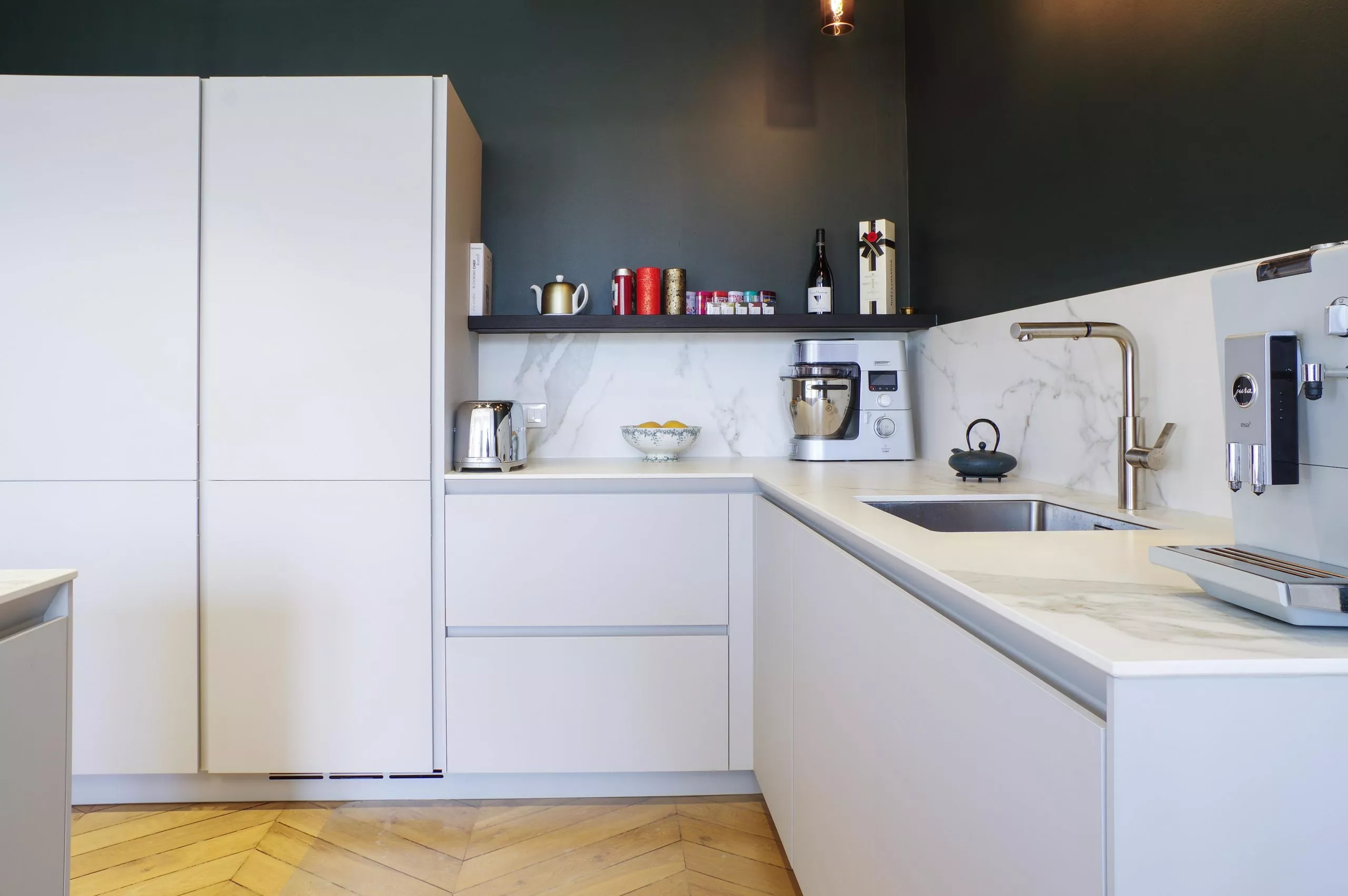 Concernant les finitions, l’équipe RBC en accord avec le client s’est orientée vers un stratifié mat soft touch, Silver Gray pour les façades.