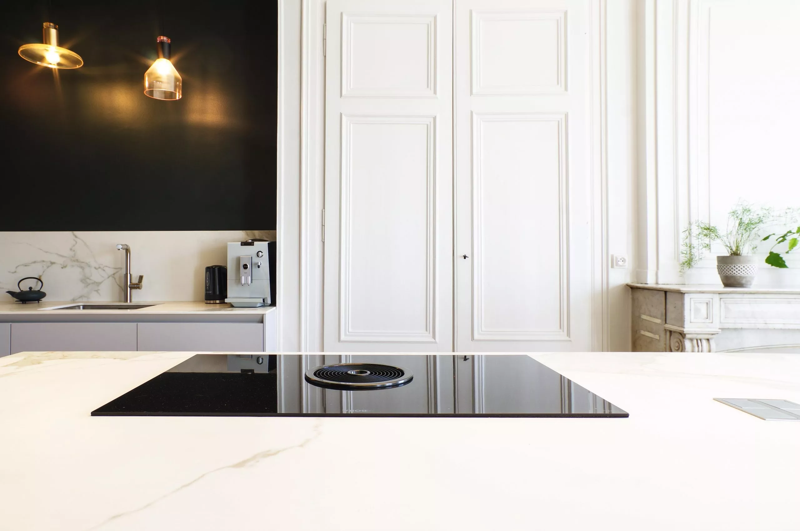 Le plan de travail et la crédence, réalisés sur-mesure en collaboration avec un artisan local, sont en céramique Neolith Stattuatio Gomet. Le piètement a également été réalisé sur-mesure, avec un artisan local.