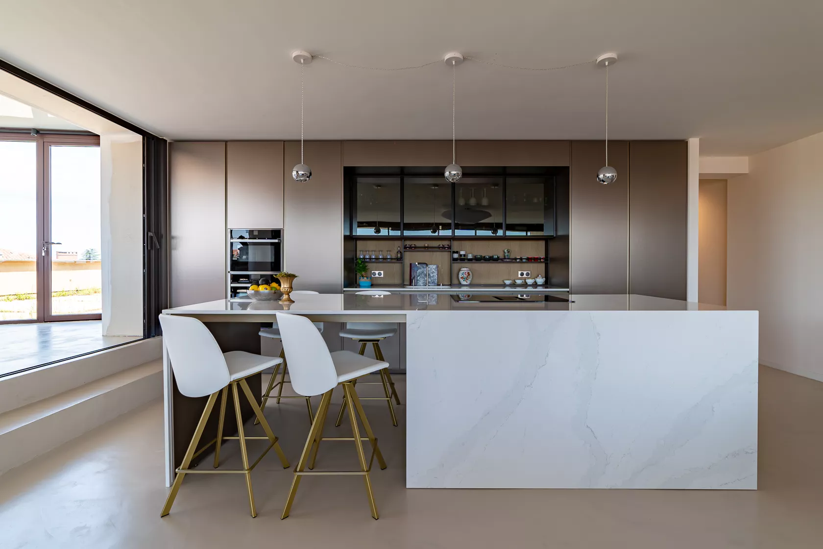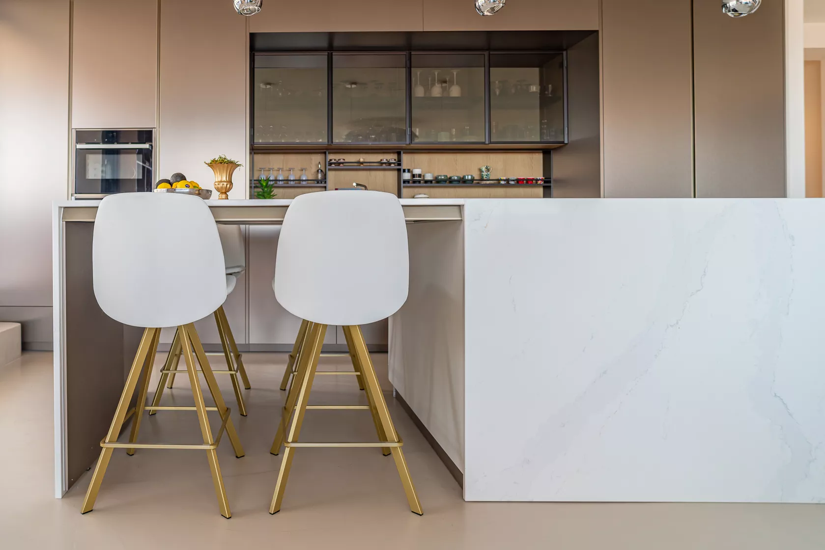 Le plan de travail, réalisé en Silestone avec une finition Calacatta Gold, incarne parfaitement l’alliance entre robustesse et élégance. Ce matériau haut de gamme, sourcé chez notre partenaire marbrier MCM, offre une durabilité exceptionnelle tout en sublimant l’esthétique générale de la cuisine avec ses veines dorées uniques.