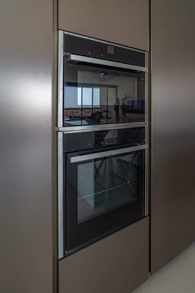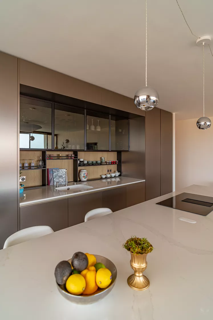 Pour cette réalisation, le choix s’est porté sur le modèle Alea Pro de chez POLIFORM, reconnu pour son design moderne et sa modularité. Les façades STM Champagne et laque Mat Bianco apportent une touche lumineuse à l’ensemble, créant un espace à la fois chaleureux et accueillant, tout en discrétion.