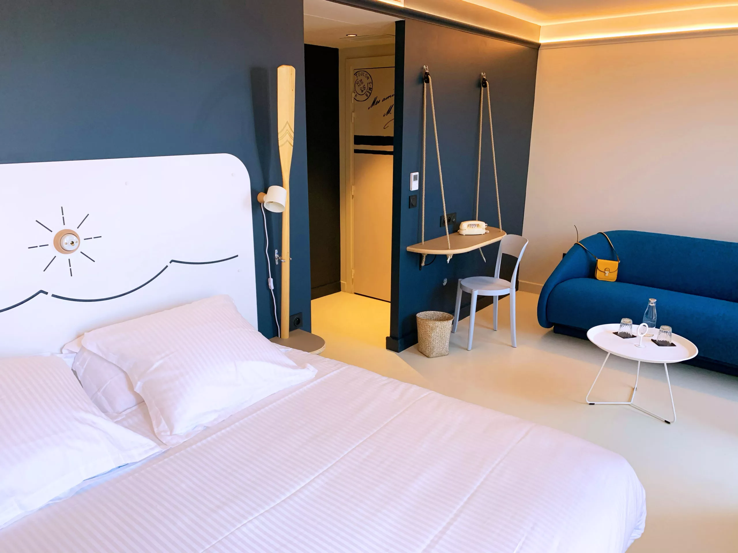 L’Eautel Toulon, complexe 4 étoiles dont la thématique est déclinée autour de du thème marin présente un ensemble graphique où se mêlent vagues, ciel, horizon, embarcations et déclinaisons de bleus, en lien avec l’histoire de la ville.