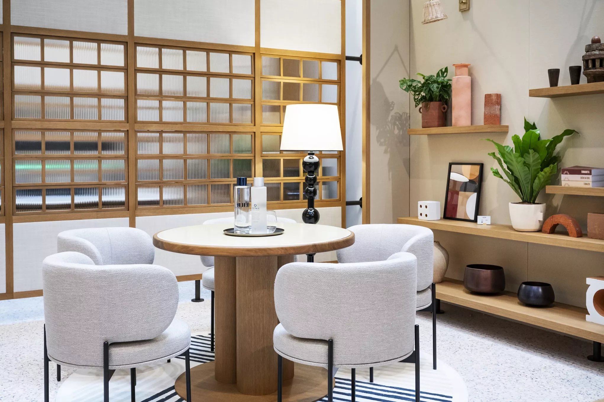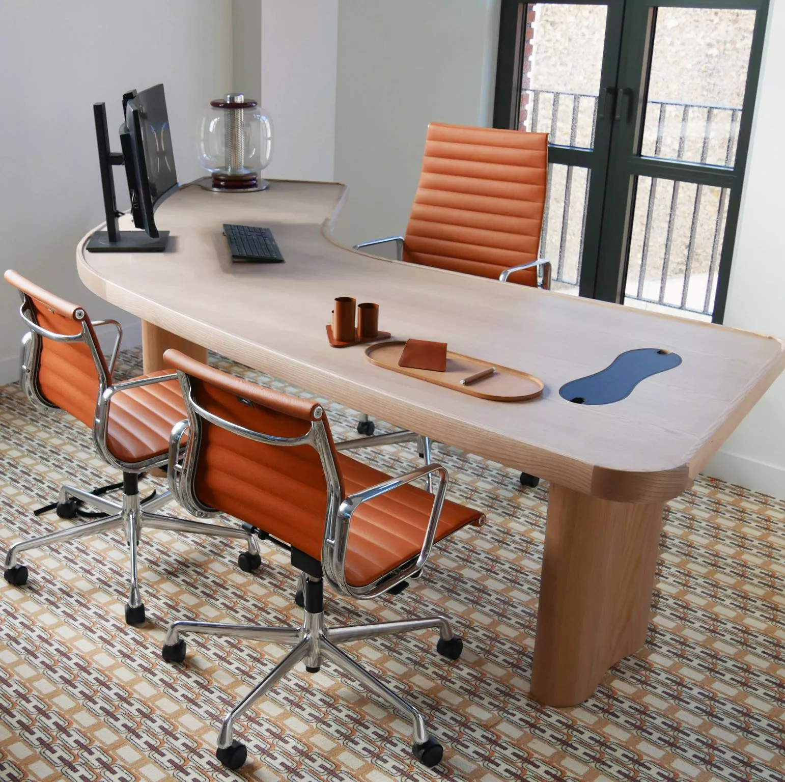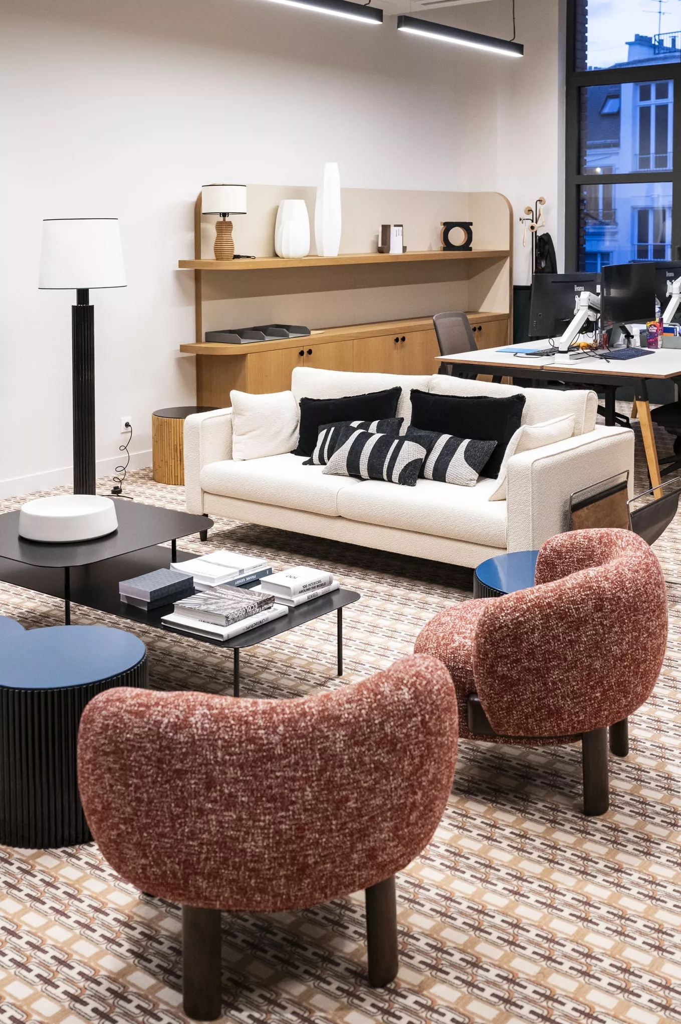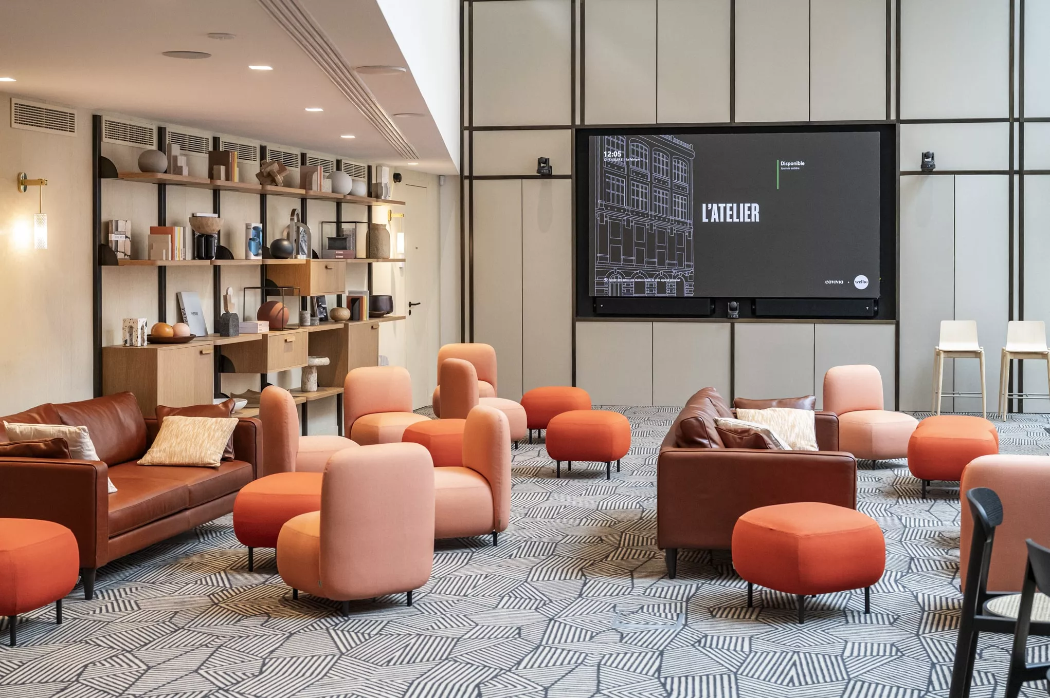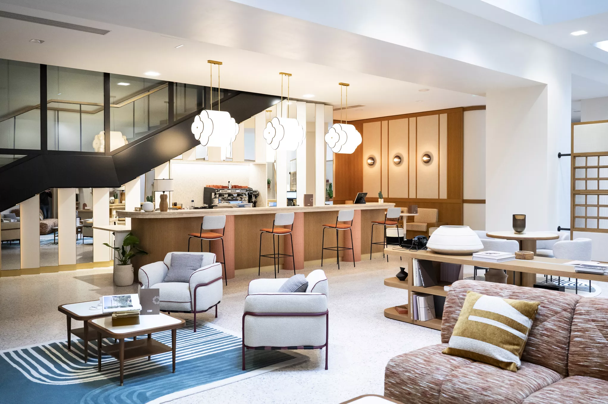 Avec ses formes douces, ses lignes courbes, l’utilisation de matériaux biosourcés, ses couleurs vitaminées et un mobilier européen soigneusement sélectionné, cet espace révèle une véritable symbiose entre les codes de l’hôtellerie et les besoins modernes en termes d’environnement de travail.