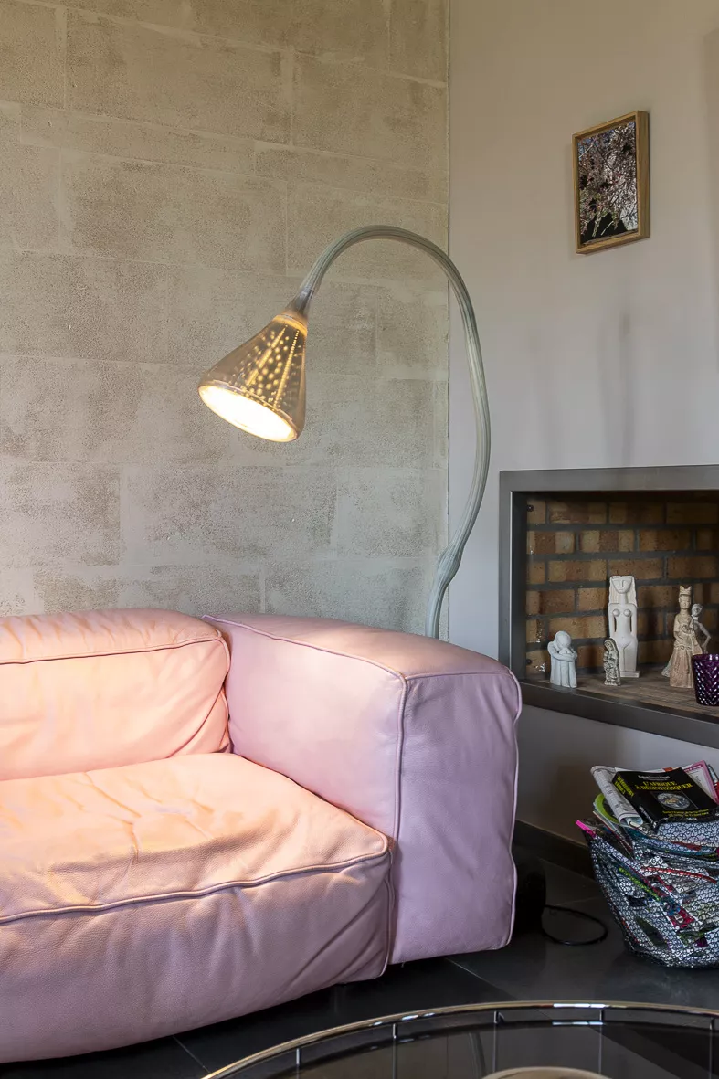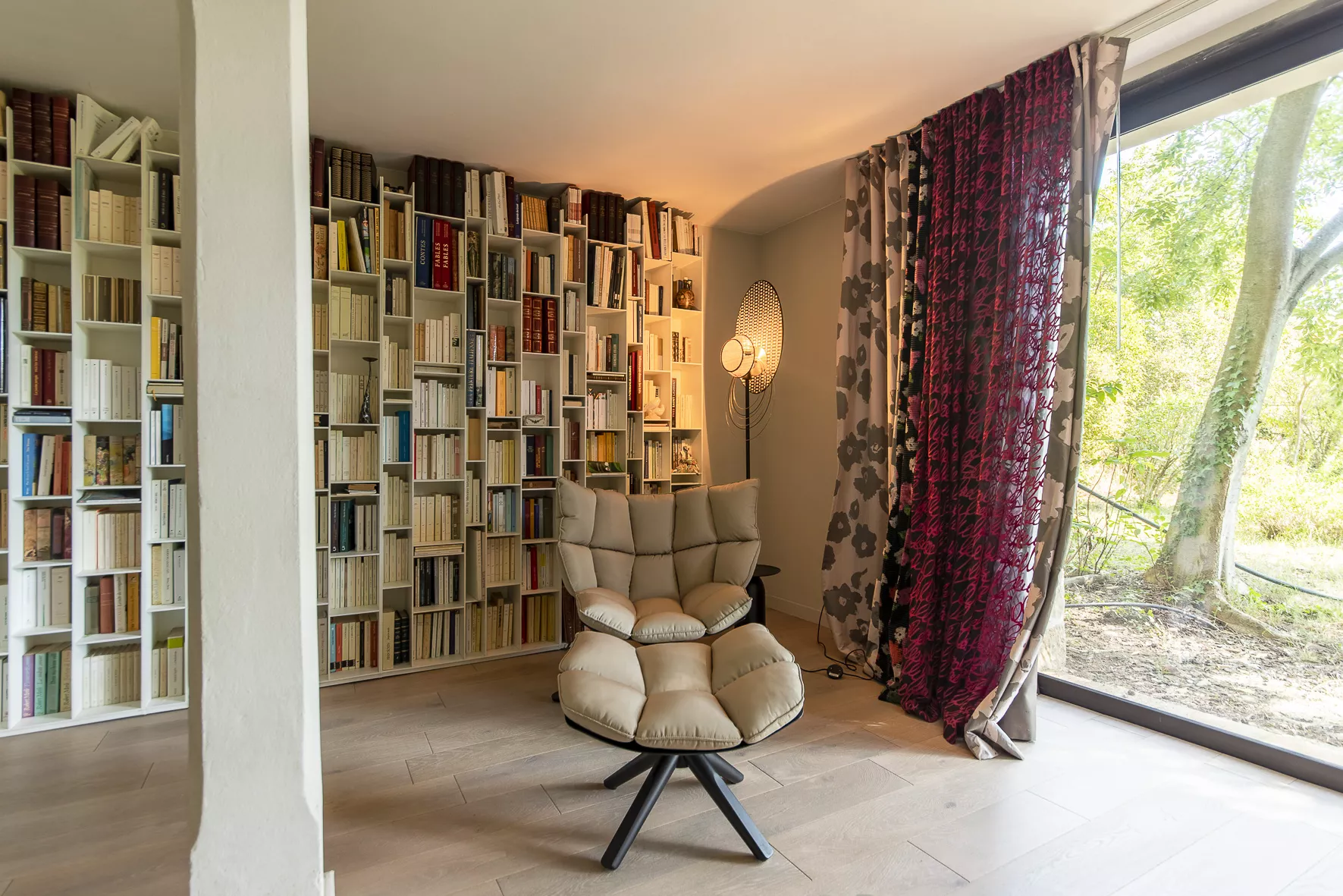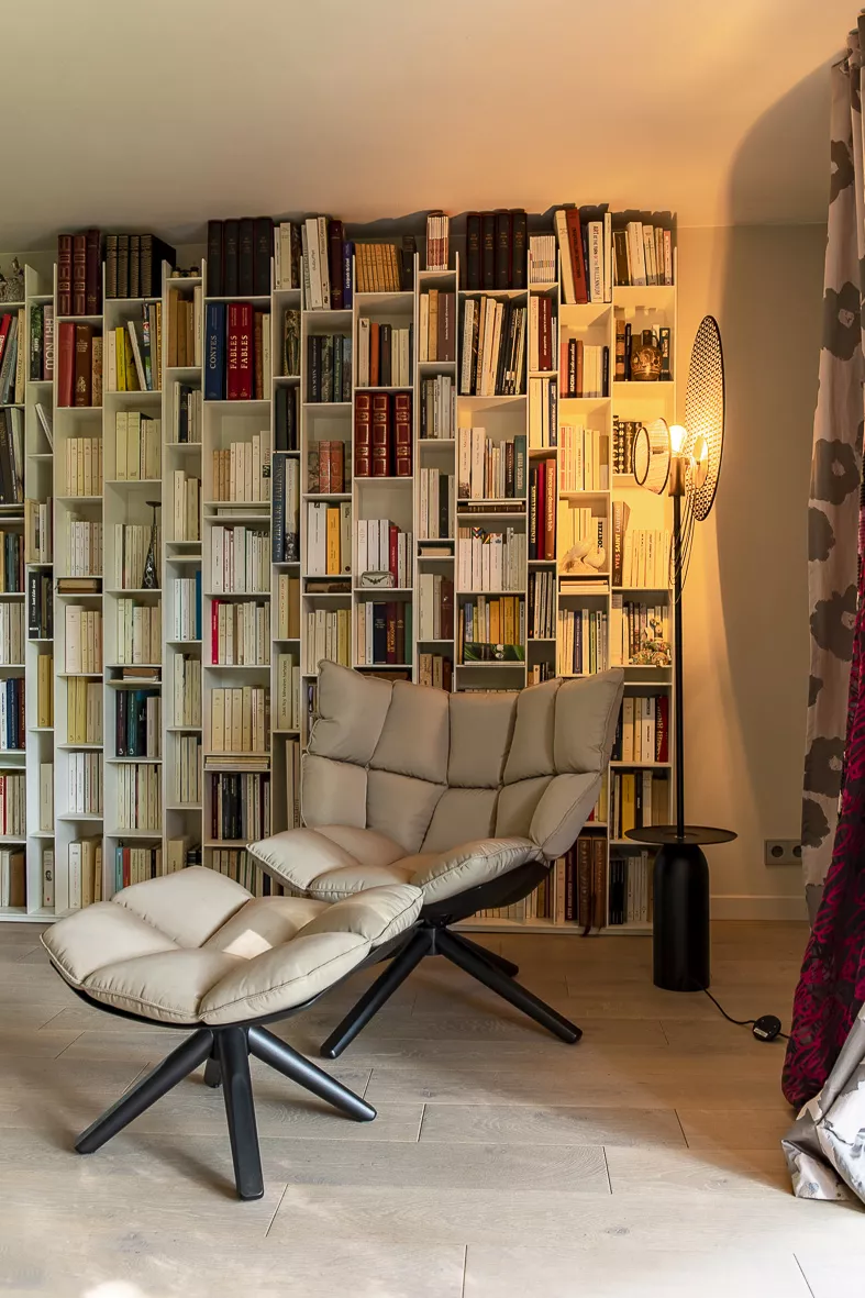 Un esprit qui se retrouve dans le salon, où le canapé et la bibliothèque roses de chez Edra se mélangent aux lignes intemporelles des fauteuils #Utrecht de Cassina, et de celles plus classiques de la commode esprit Napoléon.