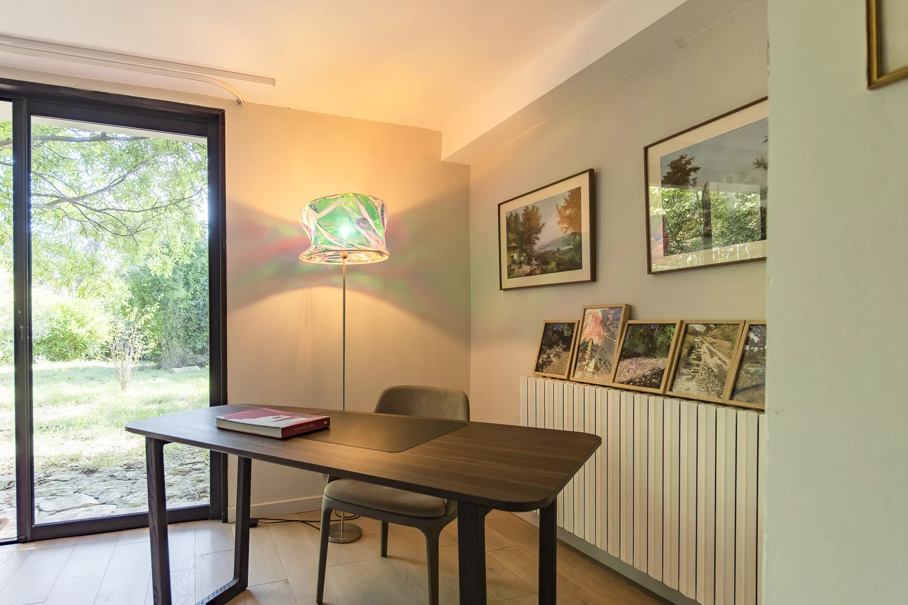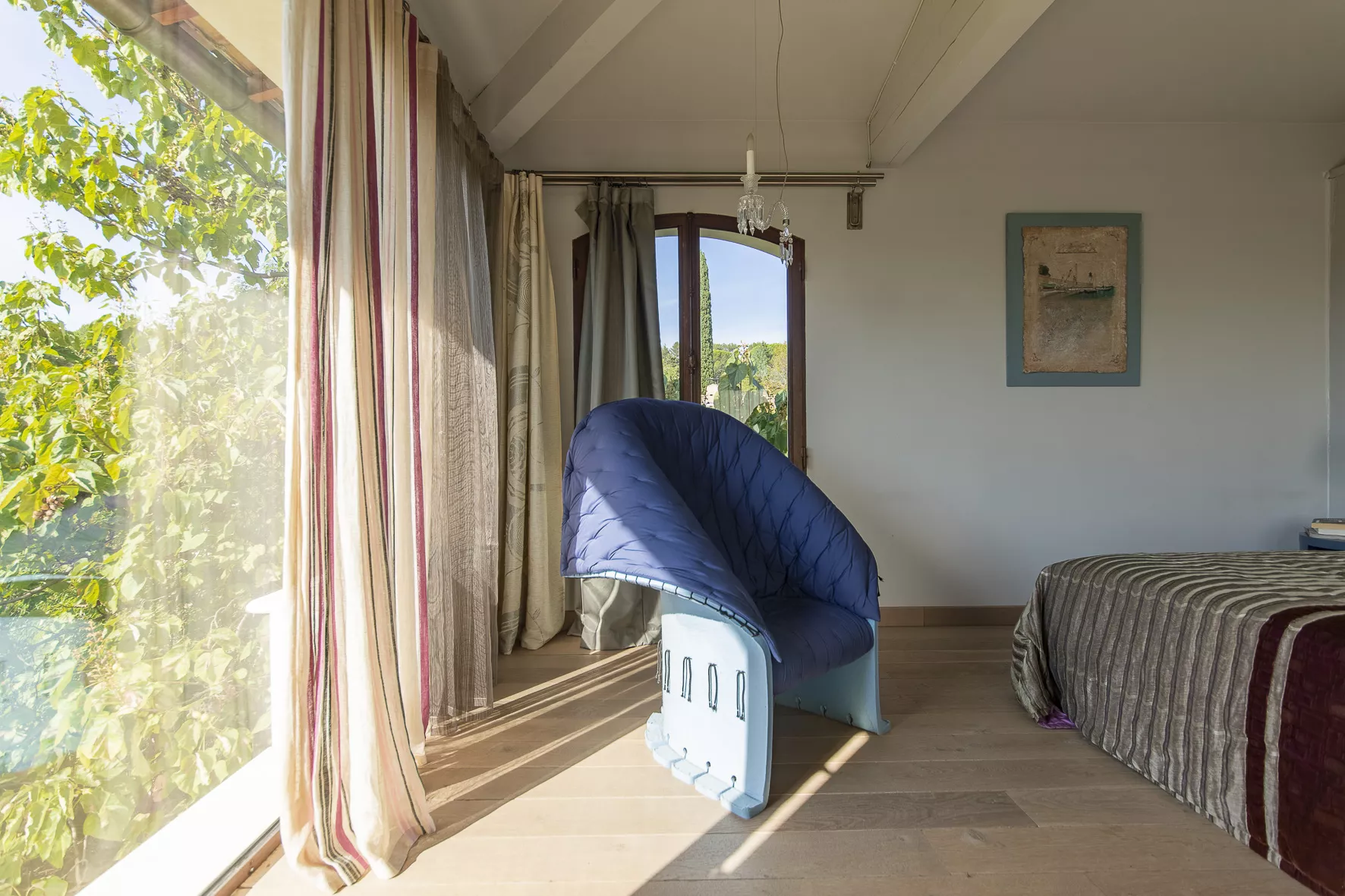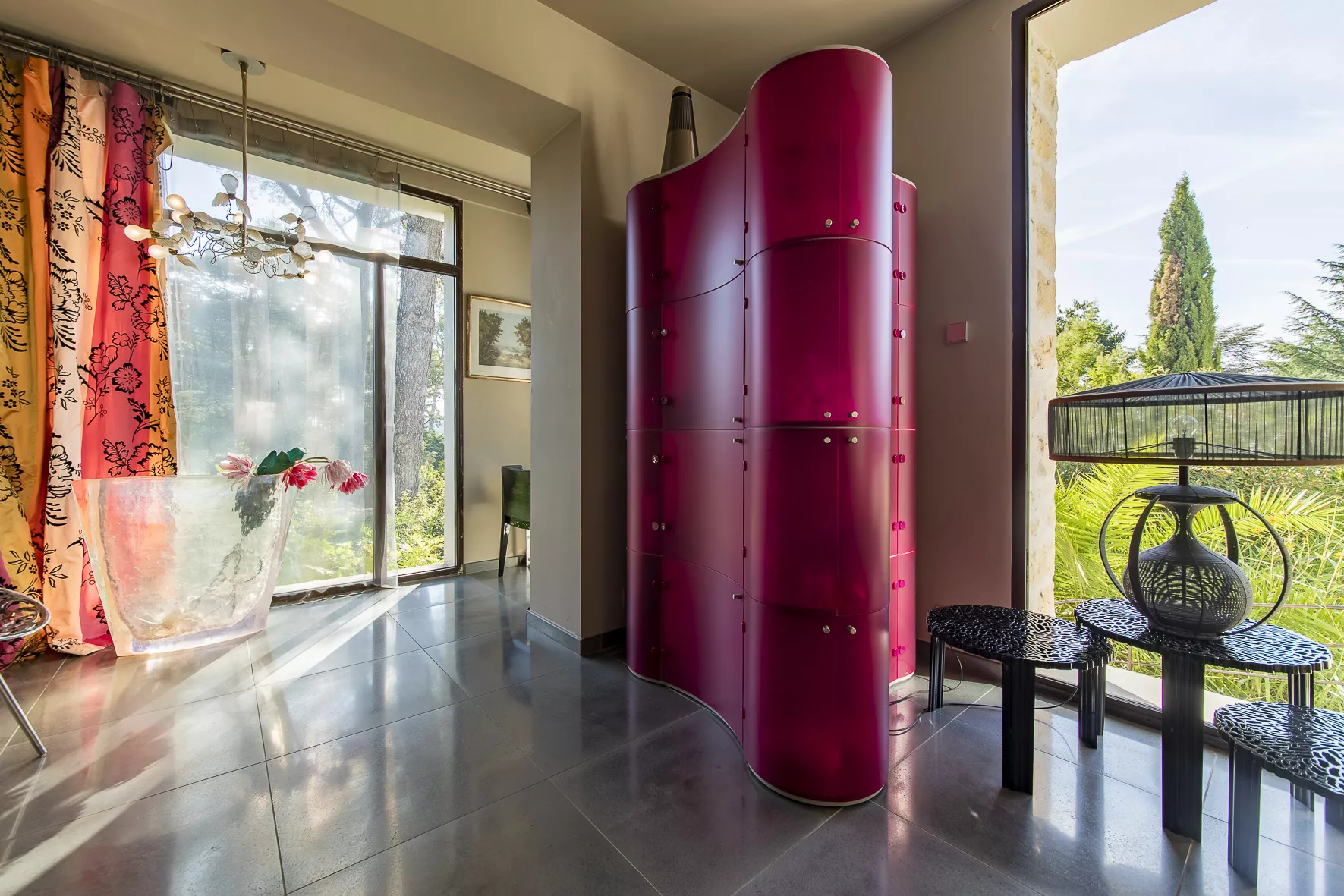 Un esprit qui se retrouve dans le salon, où le canapé et la bibliothèque roses de chez Edra se mélangent aux lignes intemporelles des fauteuils #Utrecht de Cassina, et de celles plus classiques de la commode esprit Napoléon.